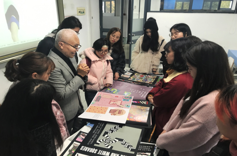 讲座开始,Henri Joli大师就所有入围作品与现场同学展开了热烈地讨论,同学们积极发言,大师不仅对每个作品都指出了其独特的闪光点,并且给出了在下一步将图案制作成成品过程中,图案的细节配置以及其在质地选材方面的经验和建议。同时,大师对同学们优秀的入围作品和其旨在传达的观点及创意点赞不绝口,感叹如若这些作品将来做成实物,一定会更加惊艳。