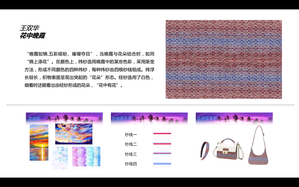 本次大赛于2018年9月启动,以“彩虹纤维色纺纱”为主要原料,采用机织、针织、编织等方式,通过色彩花型、组织结构、织造工艺等多方面的创意创新设计,完成色纺纱面料的开发与展示。大赛共收到乐玩游戏官网 学生设计稿88件,经初评确定34件作品进入打样环节。依托乐玩 实训平台,同学们在老师指导下经过3个月的努力完成打样,最终10件作品获得本次大赛入围奖。