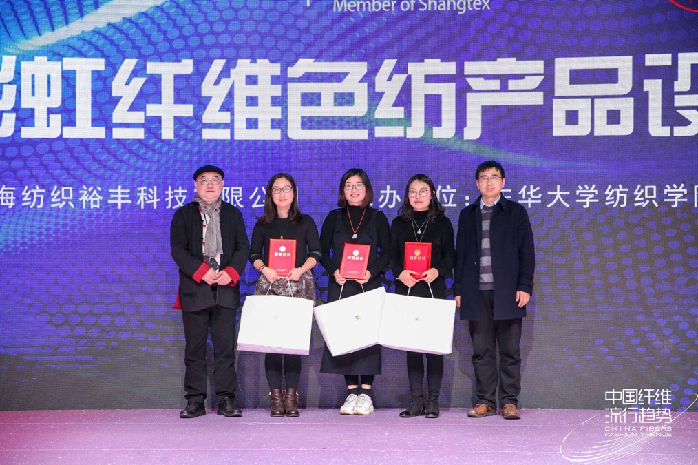 颁奖仪式上,与会嘉宾代表上海裕丰纺织科技有限公司总经理赵培、博拉经纬纤维有限公司总经理朱永军、乐玩游戏官网 教授薛文良为获得大赛入围奖的学生颁发了荣誉证书和奖品,并合影留念。