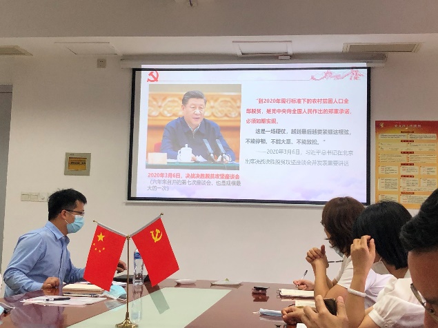 专职党务干部寿晨燕老师结合“精准扶贫”工作,并针对学习“四史”进行了指导。她从“为什么要学习‘四史’”、“为什么说学习‘四史’能坚定共产党人的信仰信念信心”等方面,谈了自己对开展“四史”学习教育的认识和体会。同时也对学习方式提出一些建议。学习采取“自学+集中学”“线下+线上”的方式,分三个阶段进行,并扩大到非党员。第一阶段,全体党员围绕有关学习资料展开自学;第二阶段,举行集中学习“四史”教育精神。第三阶段,结合部门实际,扩展到非党员学习交流体会。
