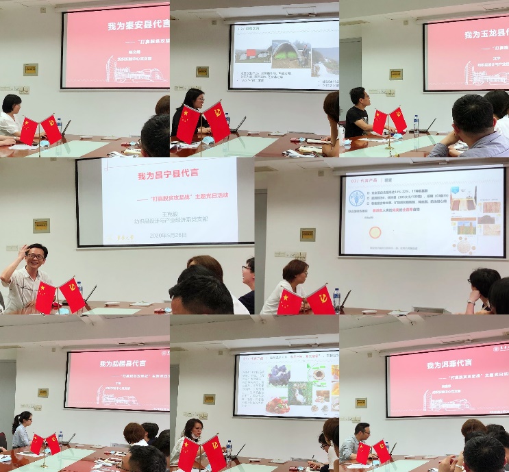 2020年是“打赢扶贫攻坚战”的收官之年。为此,2个支部8位党员结合高校“e扶贫”消费平台,进行了“我为贫困县代言”的消费扶贫讲述。丁倩老师为“勐腊县”代言,丁亦老师为“麻江县”代言,沈华老师为“玉龙县”代言,管晓宁老师为“镇坪县”代言,陈文娟老师为“秦安县”代言,刘嘉炜老师为“洱源县”代言,林婧老师为“化隆县”代言,王克毅老师为“昌宁县”代言。各位老师从各个贫困县的实际贫困情、国家脱贫政策、贫困县脱贫举措及代言产品出发,通过ppt的方式进行了别开生面的“e扶贫产品带货”。
