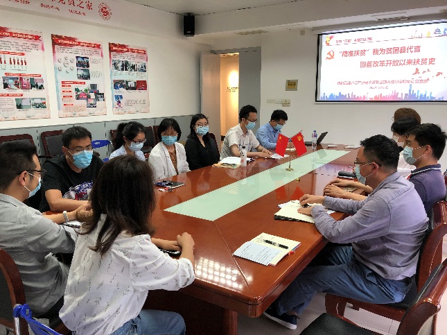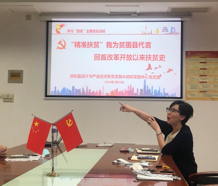 中国扶贫历史是伴随着1978年改革开放,至今已有42年的历史。在2013年习总书记提出“精准扶贫”,从此开展了近7年的“扶贫攻坚战”。为更好地学习党史、新中国史、改革开放史、社会主义发展史, 5月26日下午纺织品设计与产业经济系党支部联合纺织实验中心党支部举行了“四史”学习教育主题党日活动之“精准扶贫”我为贫困县代言,回首改革开放以来扶贫史,帮助党员深化对改革开放史的理解,并进一步强化脱贫攻坚政治责任。活动邀请了乐玩 专职党务干部寿晨燕以及曾代表学校在盐津县庙坝镇黄草社区第一书记岗位上挂职2年的辅导员张强,纺织品设计与产业经济系党支部与实验中心党支部全体党员参加。