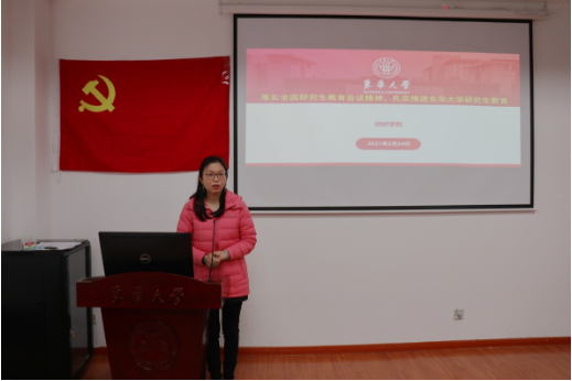 覃小红详细讲解了全国研究生教育会议精神、教育部关于印发《研究生导师指导行为准则》的通知、国务院学位委员会教育部关于印发《专业学位研究生教育发展方案(2020-2025)》的通知、教育部关于加强博士生导师岗位管理的若干意见等国家关于研究生教育的文件通知。同时,她为全体博导、硕导汇报了学校《东华大学新时代研究生教育综合改革实施方案(征求意见稿)》,对实施方案中的25条改革内容逐一讲解,帮助导师全面了解学校在研究生教育方面今后的改革和发展。