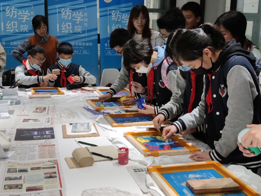 此次开放日活动分为3个板块:一流学科展示区利用220平方米展厅全方位展现东华大学一流纺织学科的概况和发展历程,陈列展品近百件,涵盖近年多个代表性成果,彰显了纺织学科的内涵和综合实力;纺织科普体验区通过生动的科普图片介绍和多形式织造小样机的动手实操,知行合一,使同学们对纺织涵义有了进一步理解;彝绣元素产品设计展通过非遗文化介绍,彝绣元素服装、配饰和文创产品的展示及手绘帆布袋和丝网印花T恤的手工活动体验,让同学们亲身体验了中华传统文化元素在纺织品设计中的应用与传承。各板块活动如火如荼地进行,每个区域配备了志愿者给同学们讲解和演示,从什么是纺织、如何纺纱织布,到纺织品设计的多样化展示以及纺织材料在多领域的广泛应用,涉及纺织行业的多方面。当谈起纺织品不仅可以满足我们日常衣食住行的需求,而且可以被做成人造血管、太阳帆板材料等在医学和航天领域应用时,同学们纷纷惊叹不已,纺织产品可谓无处不在、无时都有。