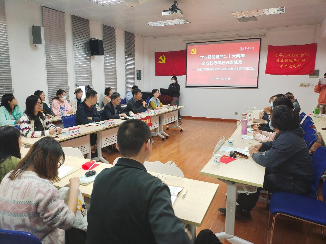 党课引发参会党员的共鸣,纺织工程系党支部张坤、庄勤亮,青春领航毕业班学生党支部温小雪、丁欣媛等师生党员代表分别结合自身实际,围绕科学研究、专业发展、教育教学、科研实践、志愿服务等方面谈了党的二十大精神的学习体会。乐玩游戏 院长顾伯洪对师生代表的发言作了点评。他希望大家要将纺织文化与教学、科研相结合,大力传承红色基因,不断提升新时代纺织文化影响力。同时要贯彻落实党中央“实施就业优先战略”要求,心怀“国之大者”,积极做好生涯规划和职业规划,促进个人全方位锻炼和全方面发展,努力成为堪当民族复兴重任的时代新人。乐玩游戏 党委书记李成龙在主持活动中指出,学习宣传贯彻党的二十大精神是当前和今后一个时期的头等大事和首要政治任务,要提高政治站位,切实把党的二十大精神学习到位、宣传到位、贯彻到位,坚持不懈用马克思主义中国化时代化最新成果武装头脑、指导实践、推动工作,以高质量党建引领保障乐玩 教学科研、人才培养、管理服务等各项工作更高质量发展。