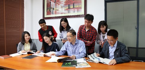 (陈南梁教授与课题组成员一起交流纺织前沿发展)
