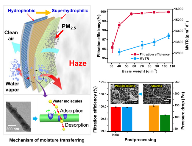 chematic illustrationof the structure of cleanable air filter and the performance demonstration of transferring moisture and effectively capturing PM2.5.
